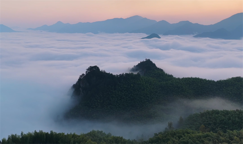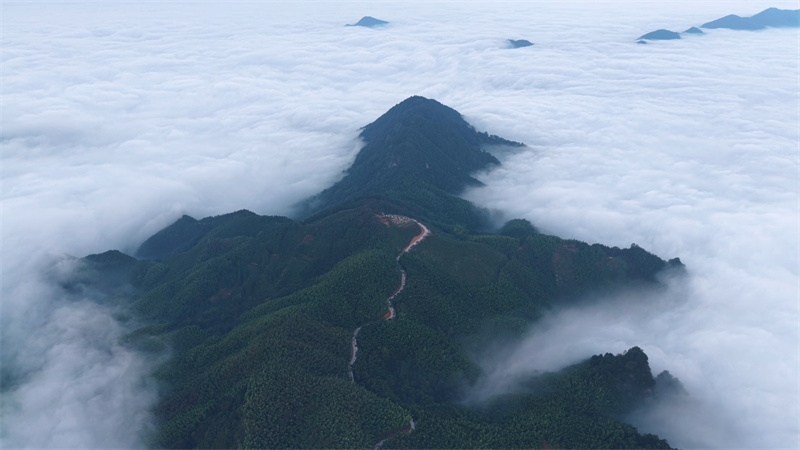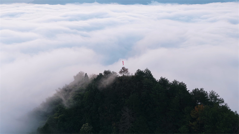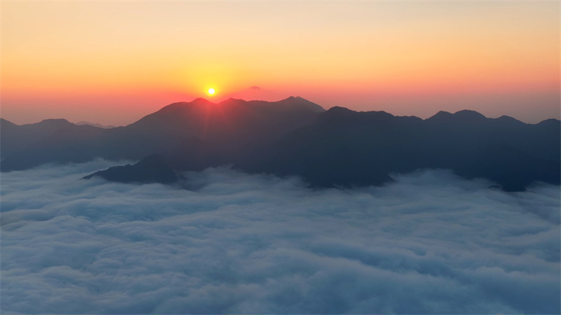 秋日清晨,安徽省宣城市旌德县白地镇高甲村的四峰庵在缭绕的云海中若隐若现。随着东方破晓,朝阳跃出云层,将金光洒向连绵山峦。山谷间云海翻腾,时而舒缓漫卷,时而奔涌如瀑,形成了壮丽的自然景观,吸引众多游客前来观赏。