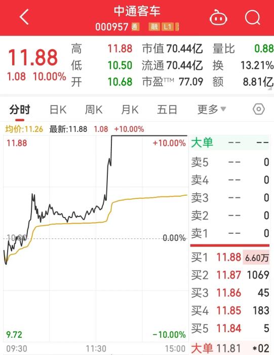 午后,中通客车股价震荡上行,13时18分短暂回调后,13时20分又再度拉升,并于13时21分涨停。