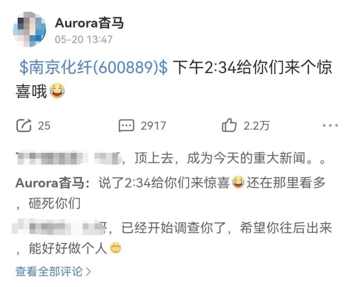 就在前一日,5月20日13时47分,有人发帖称,“南京化纤 下午2:34给你们来个惊喜哦”。20日14时34分左右,南京化纤炸板,股价一分钟之内从涨停至跌停,此前其曾连续录得“6连板”。