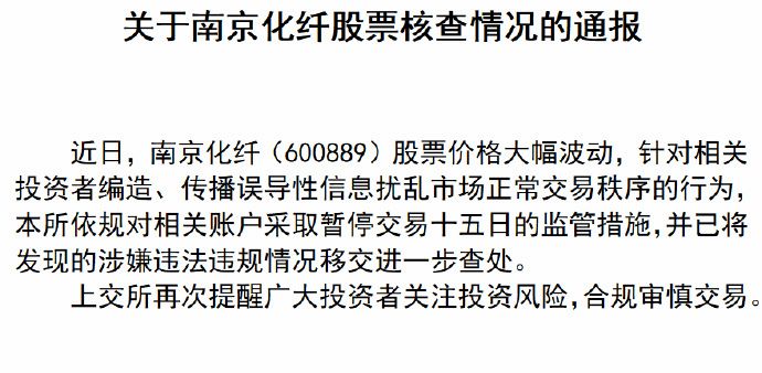 5月21日深夜,上交所发布关于南京化纤股票核查情况的通报称,近日,南京化纤股票价格大幅波动,针对相关投资者编造、传播误导性信息扰乱市场正常交易秩序的行为,上交所依规对相关账户采取暂停交易十五日的监管措施,并已将发现的涉嫌违法违规情况移交进一步查处。上交所再次提醒广大投资者关注投资风险,合规审慎交易。(完)