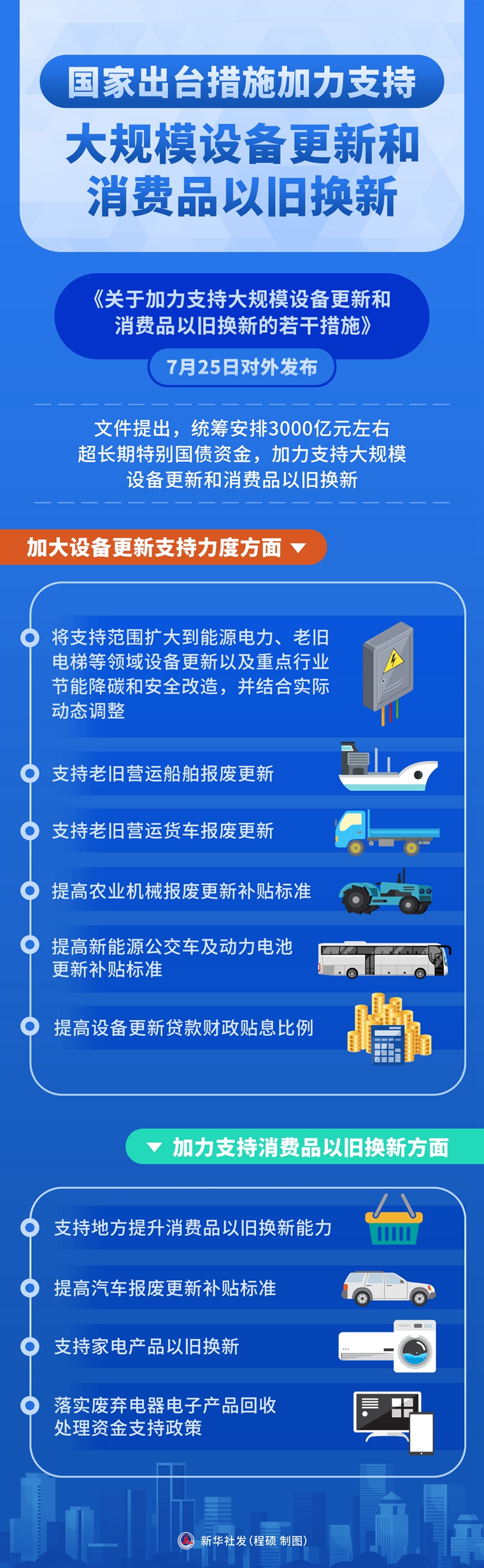 新华社北京7月25日电(记者陈炜伟、谢希瑶)《关于加力支持大规模设备更新和消费品以旧换新的若干措施》25日对外发布。文件提出,统筹安排3000亿元左右超长期特别国债资金,加力支持大规模设备更新和消费品以旧换新。