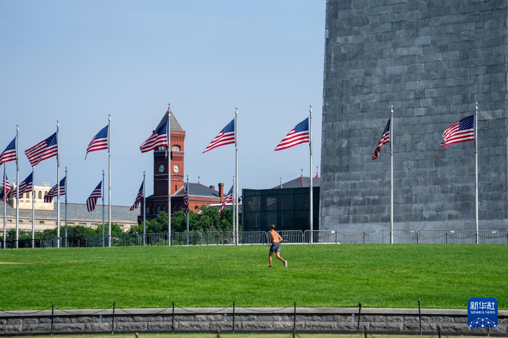 6月23日,在美国首都华盛顿,一名男子在草地上跑步。新华社记者 胡友松 摄
