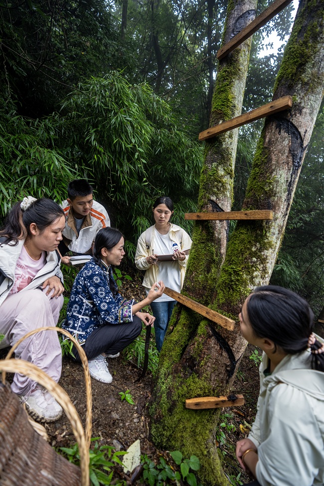 图为朱黎在恩施市青堡村深山漆林里向湖北民族大学学生传授传统割漆技艺。新华网发 文林 摄