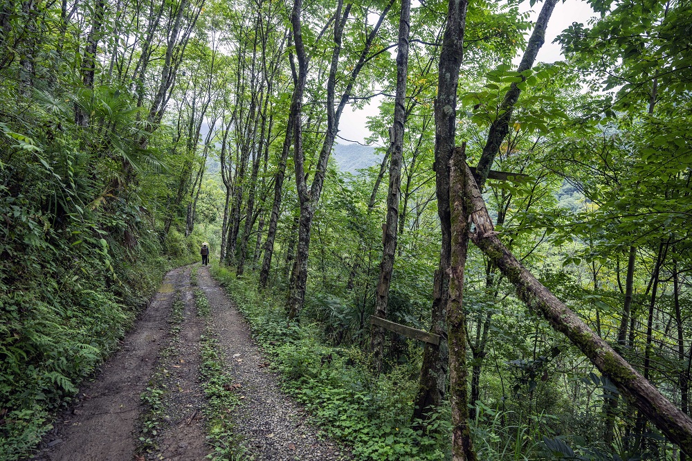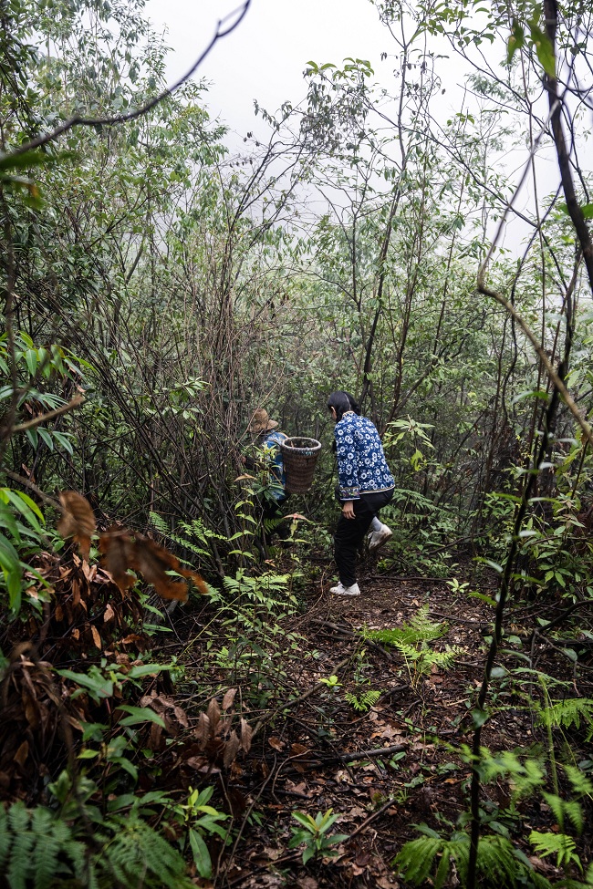 图为朱黎穿行在恩施市青堡村深山漆林里。新华网发 文林 摄