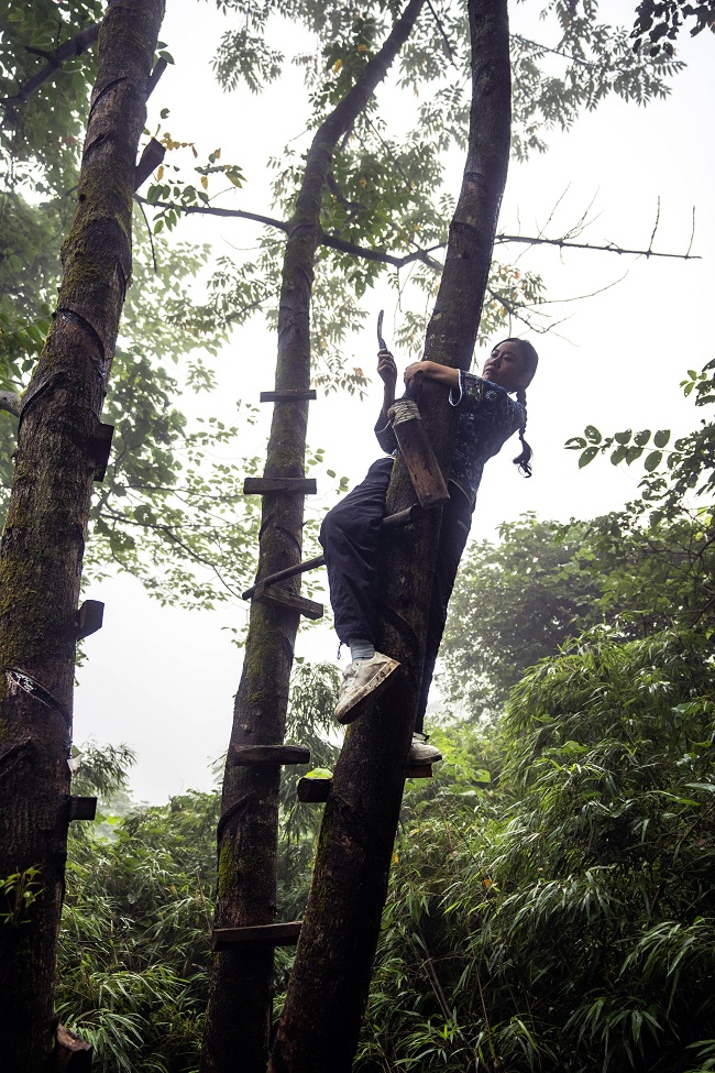 图为朱黎在恩施市青堡村深山漆林里割漆。新华网发 文林 摄