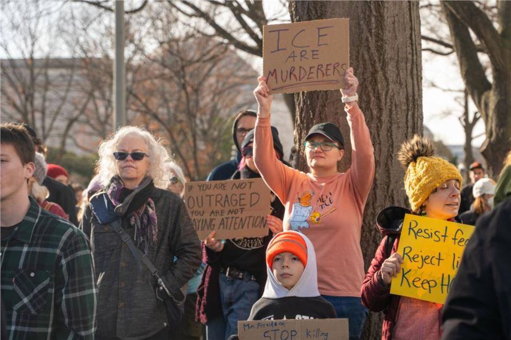 1月11日,在美国首都华盛顿,民众抗议移民与海关执法局暴力执法。??近日,美国多地民众举行游行示威,抗议移民与海关执法局执法人员在明尼苏达州明尼阿波利斯市开枪打死一名美国籍女子。??
