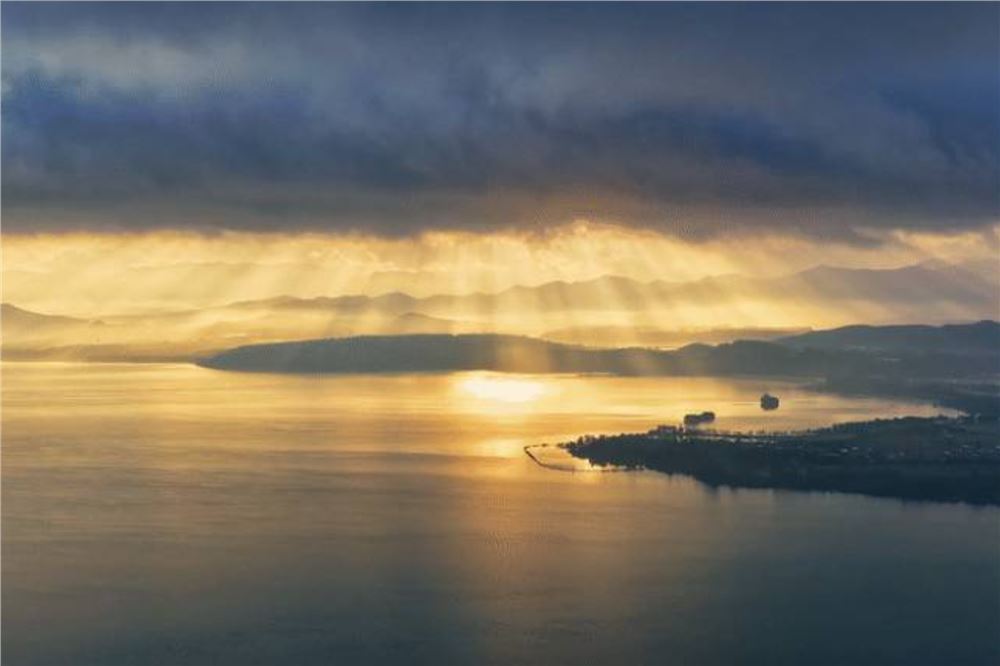仲冬时节,朝阳洒落,昆明市晋宁区滇池南岸频现丁达尔效应。 航拍镜头下,光束穿透云层倾泻而下,与滇池湖面交织出层次丰盈的光影画卷。 山影与湖光相映成景,水波潋滟、光影流转间,更显冬日滇池特有的宁静与壮美。