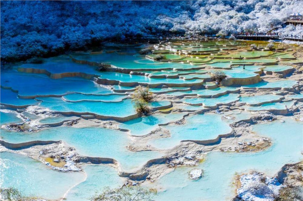 10月21日,四川省阿坝藏族羌族自治州黄龙景区迎来今秋第一场降雪,五彩池与皑皑白雪交相辉映,美不胜收。新华社发俯瞰黄龙景区五彩池一角。
