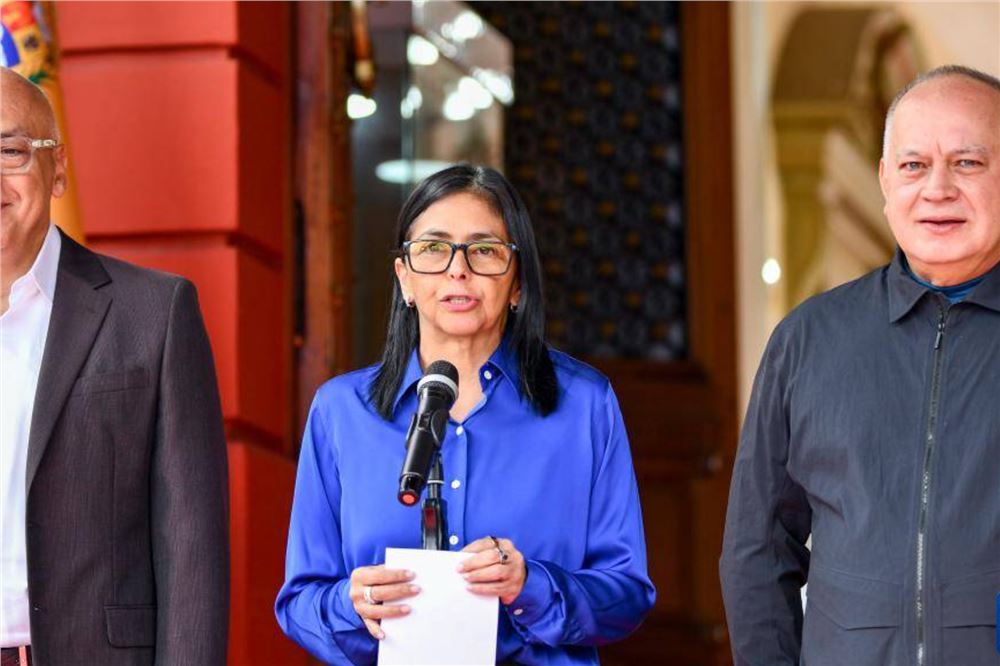 新华社加拉加斯1月14日电 委内瑞拉代总统罗德里格斯14日在社交媒体发文说,她当天同美国总统特朗普进行了一次“长时间、富有成效且礼貌”的电话会谈。1月14日,在委内瑞拉首都加拉加斯的总统府观花宫,委内瑞拉代总统德尔西·罗德里格斯(中)、全国代表大会主席豪尔赫·罗德里格斯(左)和内政部长卡韦略共同参加新闻发布会。