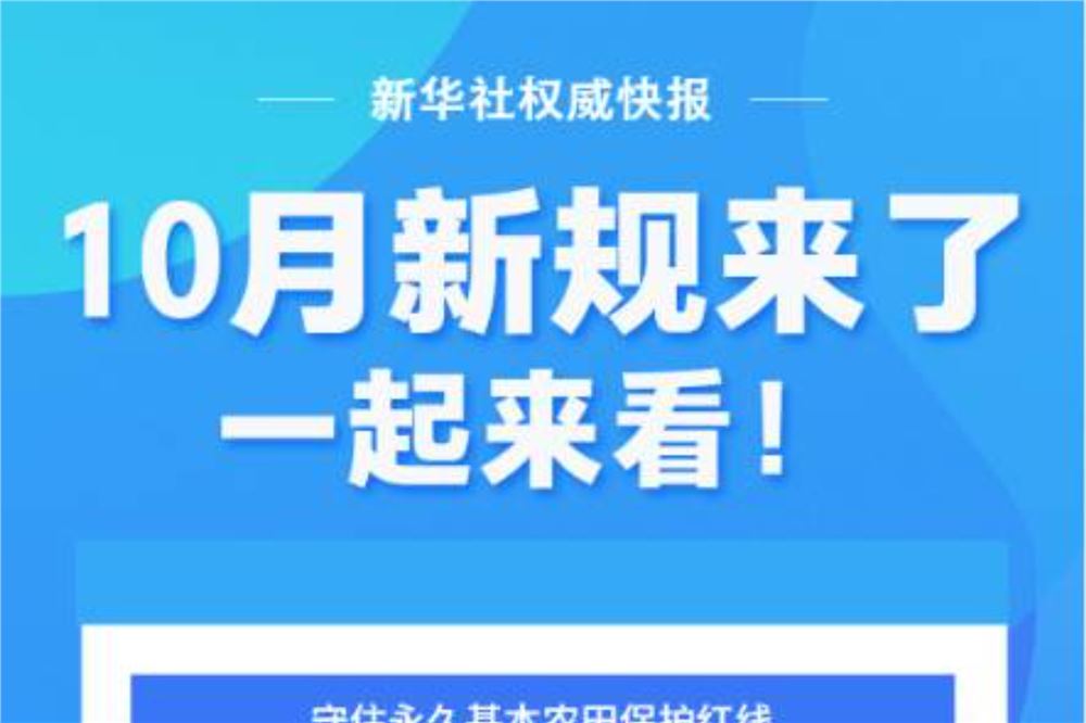 新办法守住永久基本农田保护红线;铁路、民航10月1日起全面使用电子发票;新修订的反不正当竞争法规制“全网最低价”等网络不正当竞争行为……10月新规来了,一起来看!??新华社国内部出品