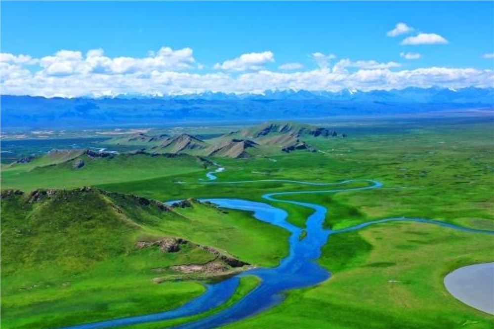 近日,新疆巴音郭楞蒙古自治州和静县巴音布鲁克镇,草原,湿地与雪山、河流构成一幅壮美的生态画卷。