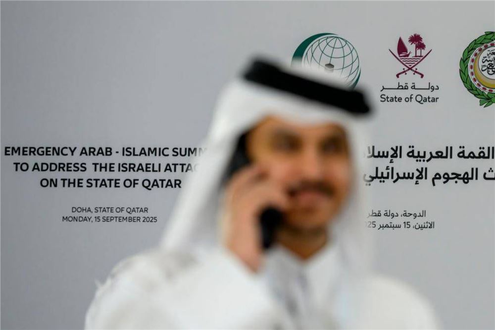 9月15日,在卡塔尔首都多哈,媒体记者在阿拉伯-伊斯兰紧急峰会新闻中心工作。峰会公报说,以色列的侵略行径是对卡塔尔主权的公然侵犯,是对国际法的公然践踏,是对地区与国际和平与安全的严重威胁。以色列必须对这次袭击承担全部责任。5名巴勒斯坦人和1名卡塔尔安全部队人员在袭击中遇难。