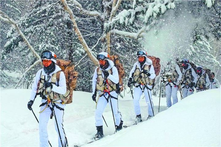 10余名队员全副武装、脚踏雪板,步调一致、鱼贯而行,飞速穿行在人迹罕至的茫茫林海雪原中。 早春,该旅一场实战化冬季雪地行军连贯课目训练,在林海雪原深处展开。他们针对结伴滑雪、伤员上送、崖壁攀登等课目特点,将体能和技能训练相结合,全面锤炼官兵雪域作战能力。